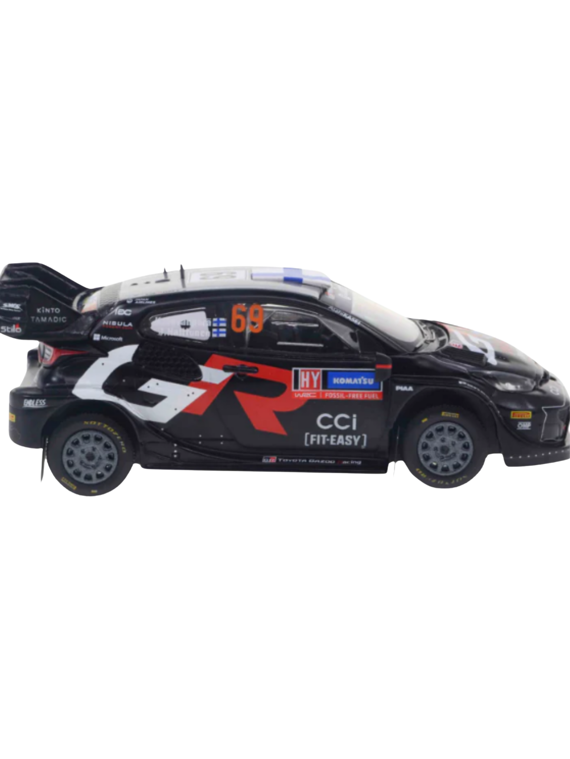 A 1/43 scale replica model of the TOYOTA GR YARIS RALLY1 HYBRID - No.69 car driven by Kalle Rovanpera and co-driver Jonne Halttunen at the 2024 Rally Sweden.